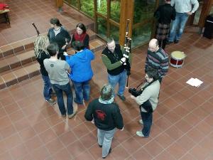 Am vergangenen Mittwoch stand eine "Exkursion" an - der VHS-Kurs besuchte unsere Bandprobe im Proberaum in der Polizeischule Stukenbrock, um einen Einblick in den Probenablauf einer Pipeband zu gewinnen, die schon geübten Stücke gemeinsam bei der PC-Probe zu spielen und erste Schritte auf dem Dudelsack zu unternehmen. Wir wünschen den "Schülern" allzeit viel Spaß und Erfolg beim Spielen.