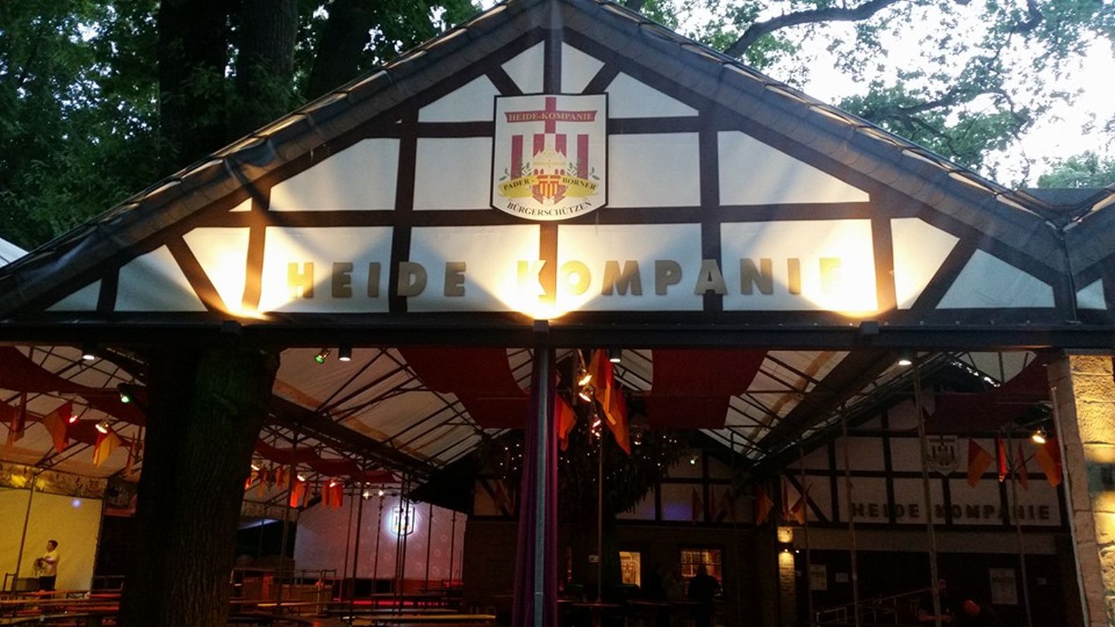 Nach einer kurzen Pause auf dem Schützenplatz spielten wir mit einigen Stücken in der Heidekompanie auf, bevor wir zusammen mit Vertretern der Heide-Kompanie zum Marsch durch die Kompanien ansetzten. (Jede Kompanie in Paderborn hat ihre eigene Baude, in der sie für sich feiern.)
