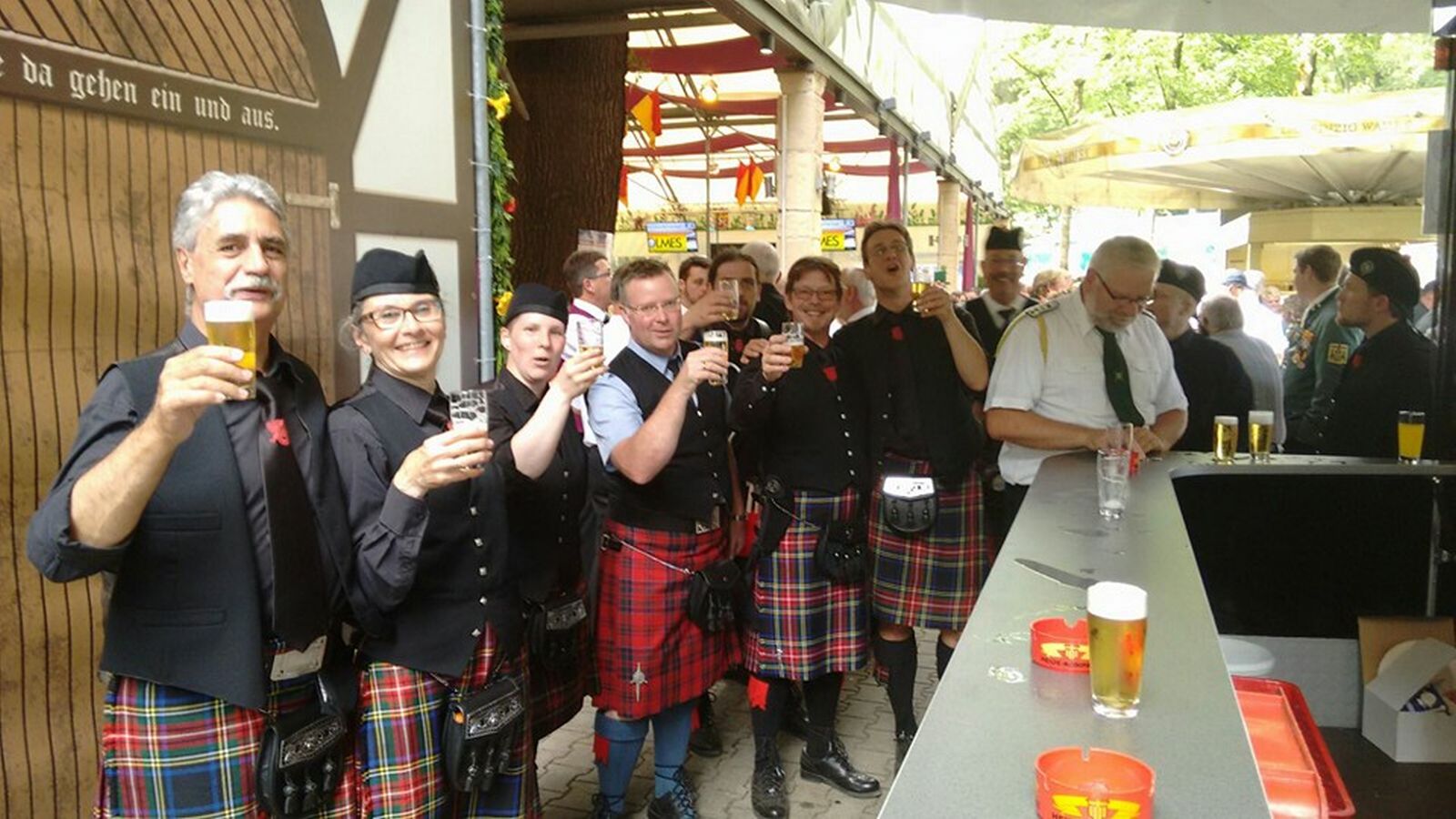 Angeführt wurden wir dabei von Drum-Major Chris, der zu einer drei Mann starken Abordnung der Coriovallum-Pipeband gehörte, welche uns bei diesem Gig unterstütze. Seinen Anweisungen folgten 15 Piper und 4 Drummer auf dem Marsch zum Schützenplatz.