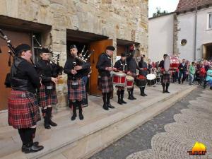Die Pfarrgemeinde ist (ungewöhnlicherweise) noch sehr jung. Und alt zugleich. 3 Paderborner Südstadt-Gemeinden fusionierten in diesem Jahr zur neuen Gemeinde St. Julian und sogleich wurde am vergangenen Sonntag im Schatten der St. Meinolf-Kirche das Gemeindefest gefeiert. Mit dabei waren, wie gesagt, wir. Die Highland Dragon Pipe Band sorgte mit einem halbstündigen Auftritt vor der Kirchentür für schottischen Flair.