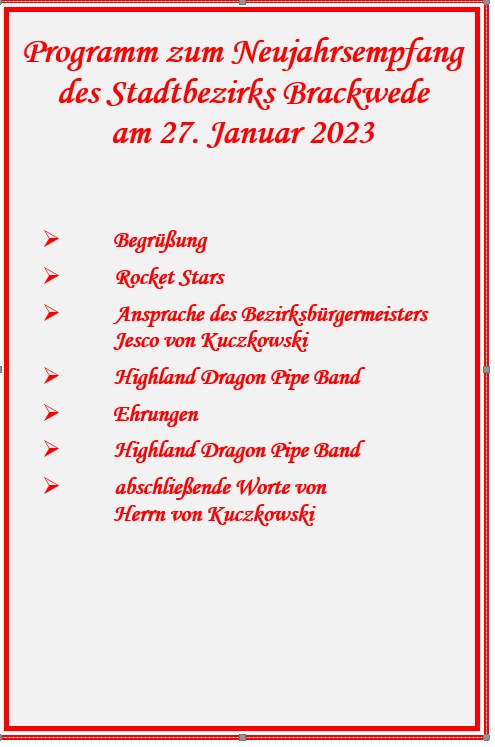 Eines dieser Highlights findet im März statt. Das Highlight ist eng verknüpft mit dem Bezirksamt Brackwede - und das Bezirksamt Brackwede hatte heute Abend, am 27. Januar, im Gymnasium Brackwede seinen Neujahrsempfang.